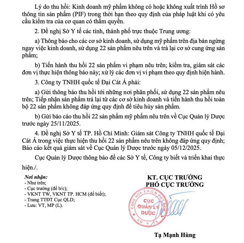 Công ty TNHH Quốc tế Đại Cát Á phải gửi thông báo thu hồi đến các đơn vị phân phối, tiếp nhận sản phẩm trả lại và thu hồi toàn bộ 22 sản phẩm để tiêu hủy, báo cáo kết quả về Cục Quản lý Dược trước ngày 25/11/2025. Sở Y tế TP HCM được giao giám sát quá trình thu hồi và báo cáo trước ngày 5/12/2025.