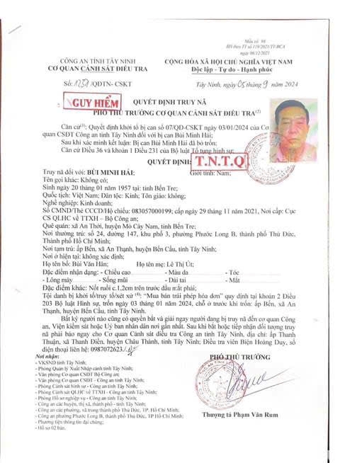 Ngày 5/9, Cơ quan CSĐT Công an tỉnh Tây Ninh đã ra Quyết định truy nã toàn quốc đối với Bùi Minh Hải (SN 1957, ngụ TP Thủ Đức, TP Hồ Chí Minh) về tội "Mua bán trái phép hóa đơn" theo quy định tại khoản 2 Điều 203 BLHS.