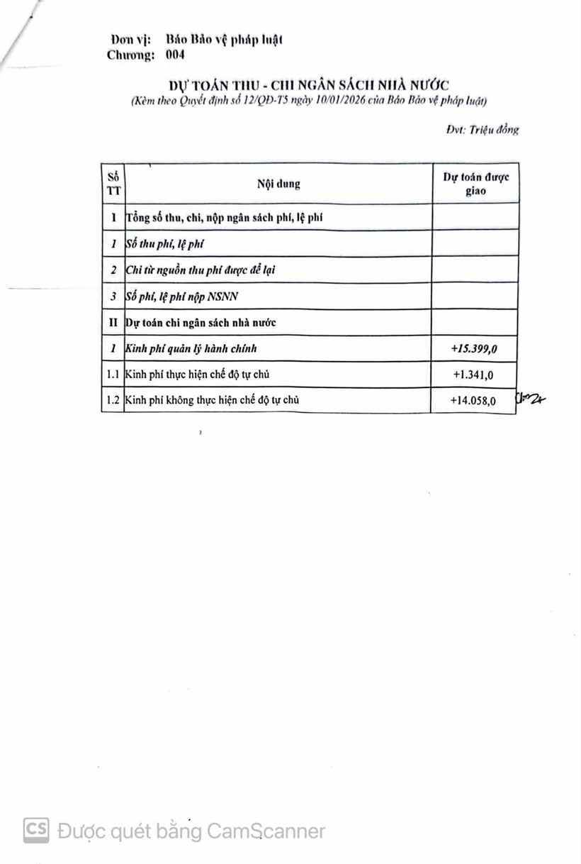 Thực hiện quy định về công khai tài chính theo Thông tư số 61/2017/TT-BTC ngày 15/6/2017, Báo Bảo vệ pháp luật đăng công khai giao dự toán chi NSNN năm 2026