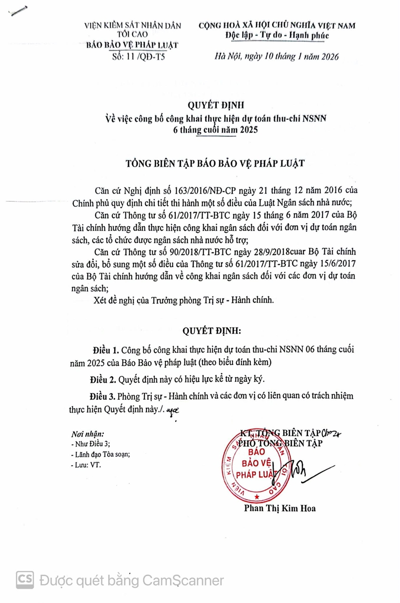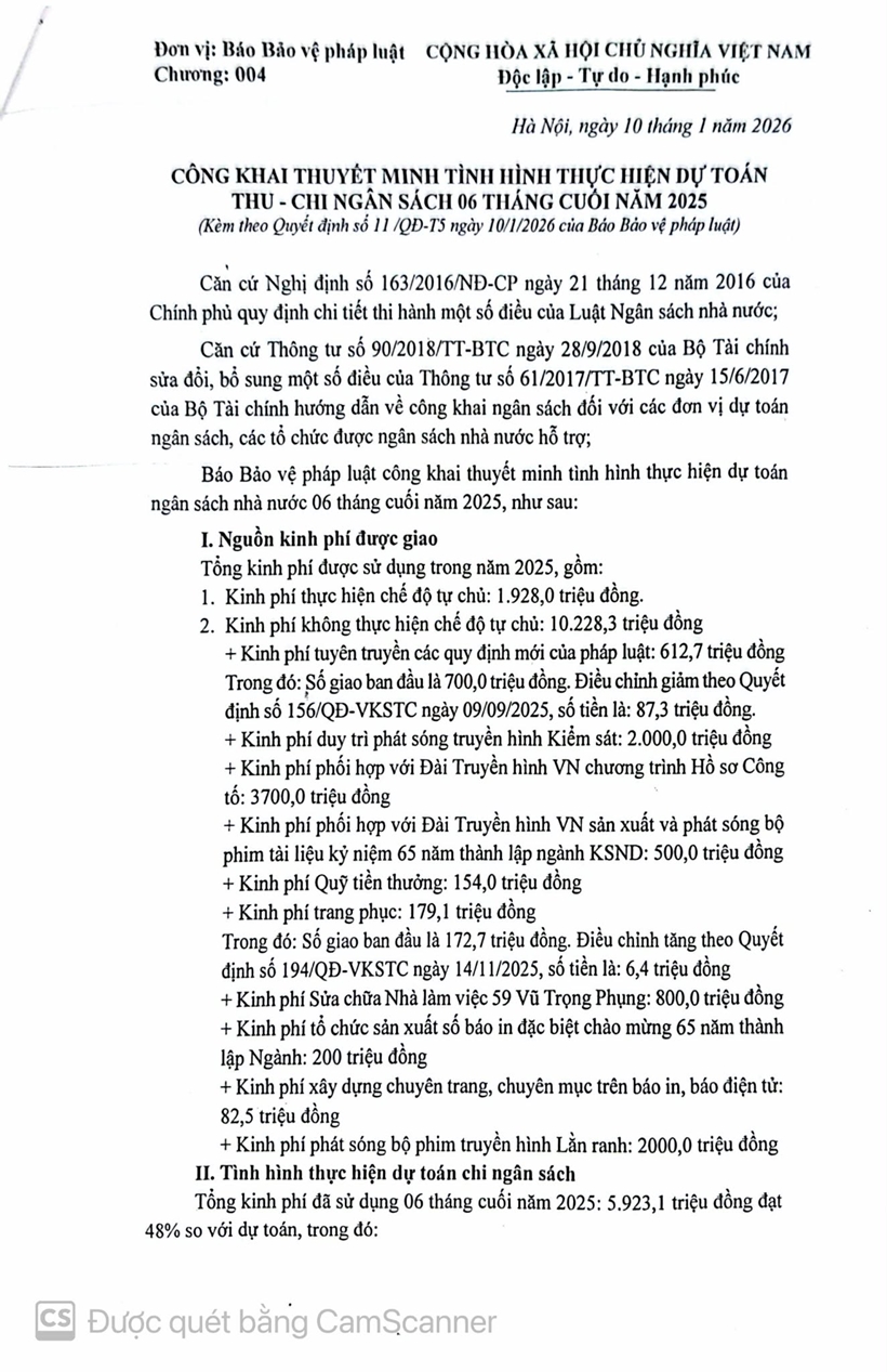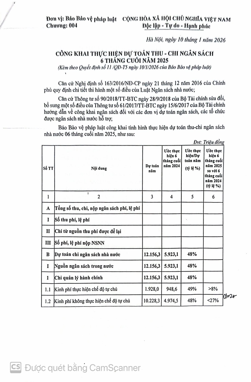 Thực hiện quy định về công khai tài chính theo Thông tư số 61/2017/TT-BTC ngày 15/6/2017, Báo Bảo vệ pháp luật đăng công khai thực hiện dự toán thu- chi NSNN 6 tháng cuối năm 2025.