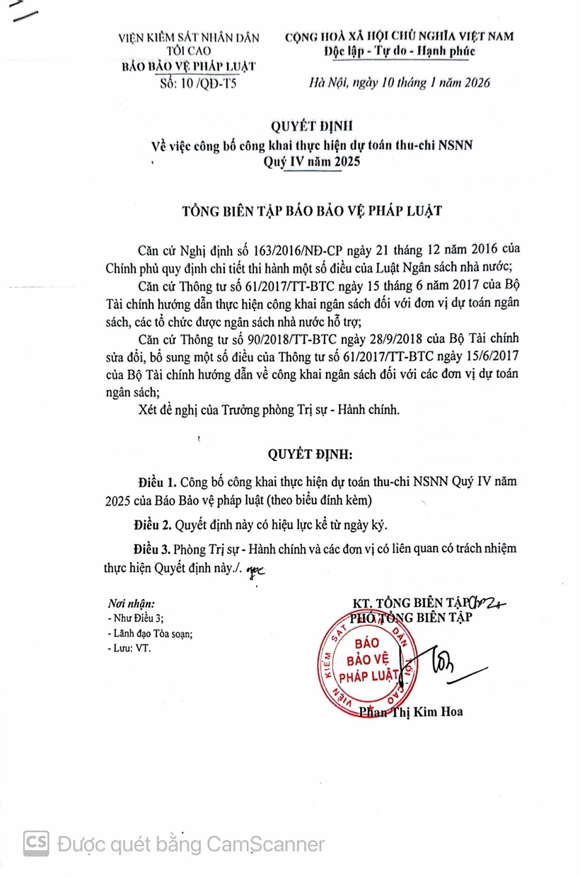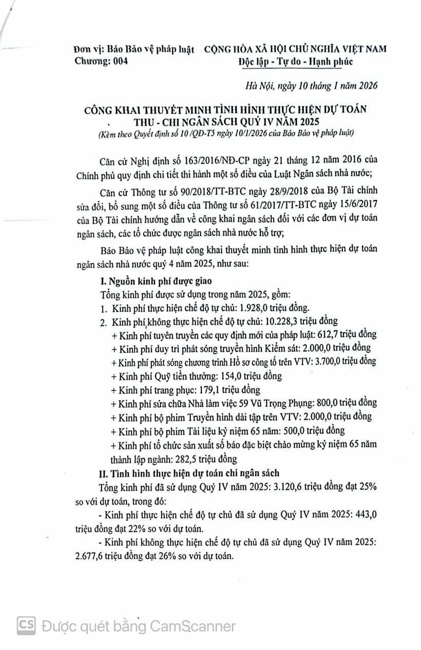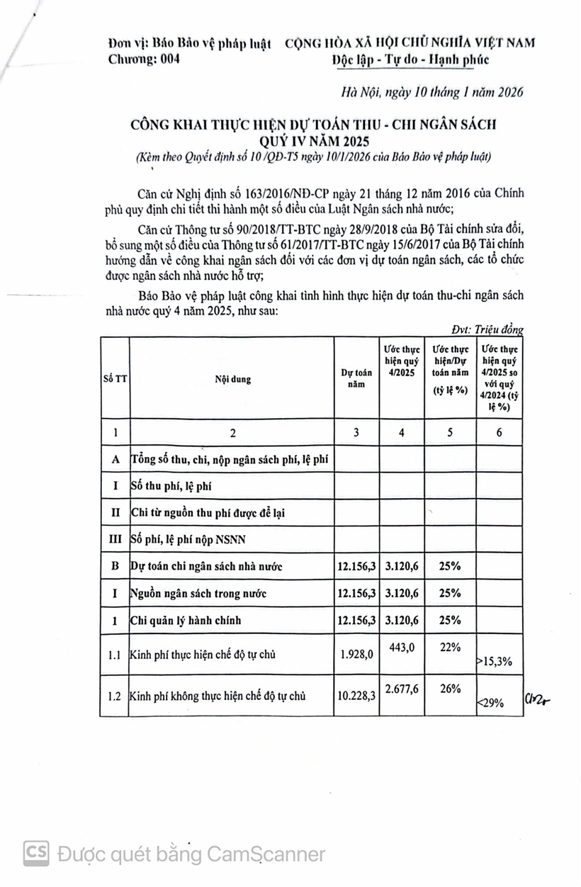 Thực hiện quy định về công khai tài chính theo Thông tư số 61/2017/TT-BTC ngày 15/6/2017, Báo Bảo vệ pháp luật đăng công khai thực hiện dự toán thu- chi NSNN Quý IV năm 2025