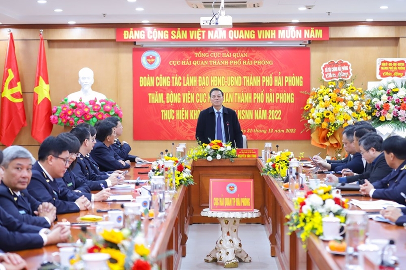 Chủ tịch UBND thành phố Nguyễn Văn Tùng ghi nhận kết quả Kho bạc nhà nước thành phố Hải Phòng, Cục Thuế thành phố, Cục Hải quan TP Hải Phòng đã đạt được trong năm 2022, biểu dương tình thần trách nhiệm, sự nỗ lực, cố gắng của cán bộ, công chức các ngành hoàn thành tốt nhiệm vụ được thành phố, Trung ương giao.