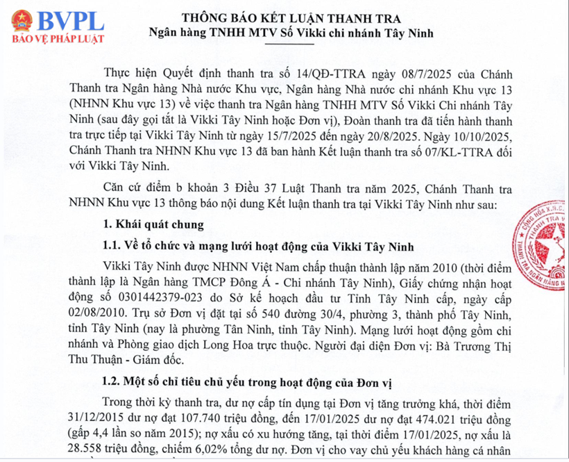 Như báo Bảo vệ pháp luật đã thông tin, mới đây Thanh tra Ngân hàng Nhà nước chi nhánh Khu vực 10 và Khu vực 13 đã ban hành Thông báo Kết luận Thanh tra Ngân hàng TNHH MTV Số Vikki (gọi tắt là Ngân hàng Số Vikki) đối với chi nhánh Bình Thuận, Tây Ninh và Long An.