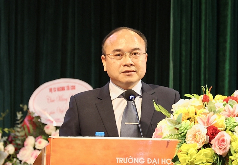 | Đồng chí Nguyễn Văn Khoát, Hiệu trưởng Trường Đại học Kiểm sát Hà Nội đọc diễn văn tại Lễ kỷ niệm. |