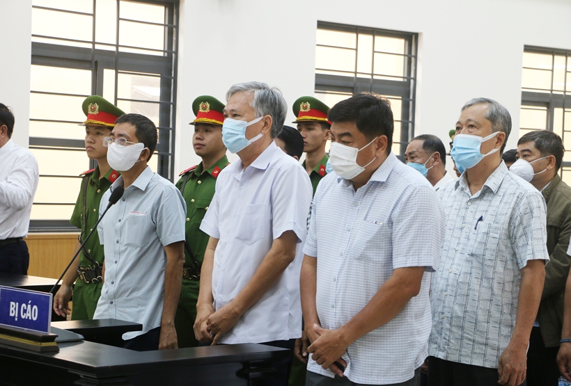 | 3 cựu Phó Chủ tịch UBND TP Long Xuyên (nay là phường Long Xuyên, tỉnh An Giang): Nguyễn Bảo Sinh, Đào Văn Ngọc và Huỳnh Giang Sơn và các bị can liên quan có mặt tại phiên tòa ngày 15/1. |