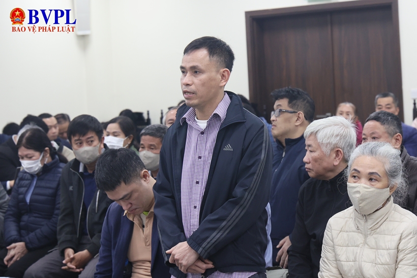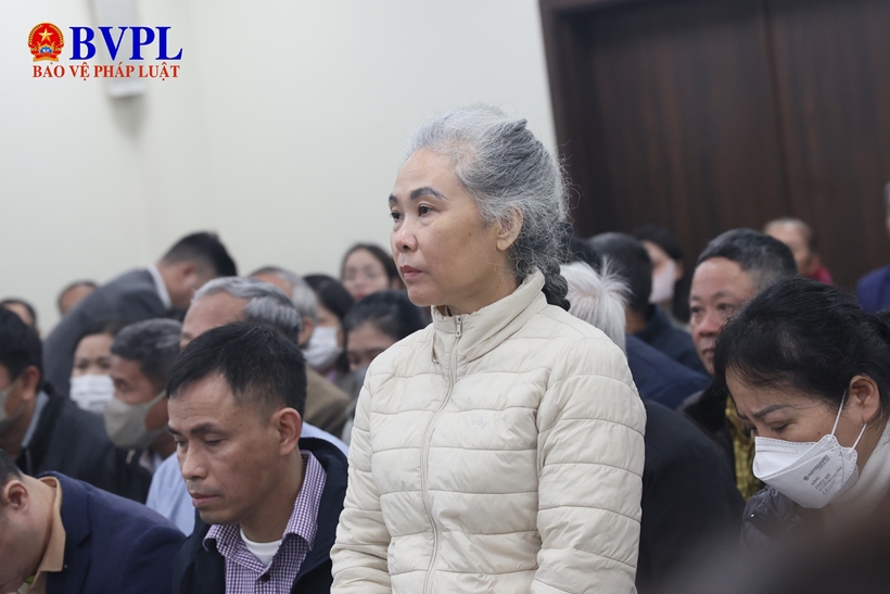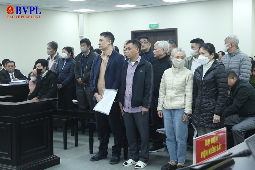 | Các bị cáo đứng nghe đại diện Viện kiểm sát công bố cáo trạng tại phiên tòa. |