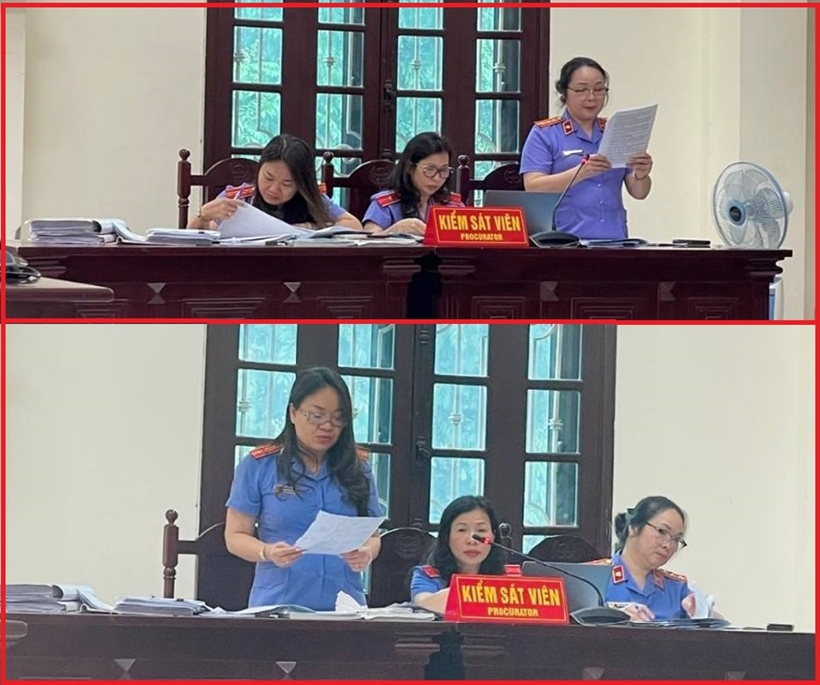 Tại phiên tòa, Kiểm sát viên công bố cáo trạng, trình chiếu tài liệu, chứng cứ điện tử đã được số hóa để chứng minh hành vi phạm tội của các bị cáo.