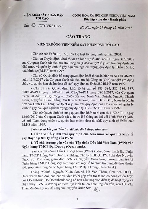 | Cáo trạng số 13/CTr-VKSTC-V3 ngày 27/12/2017 của VKSND Tối cao truy tố bị can Đinh La Thăng và đồng phạm trong vụ án gây thiệt hại 800 tỷ đồng tại PVN |