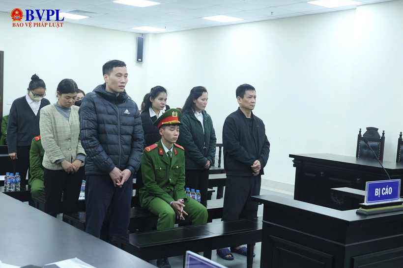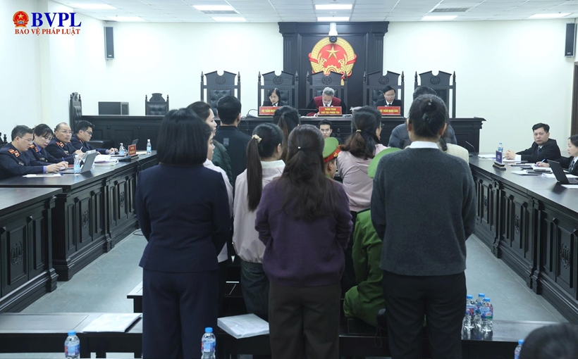 | "Bà trùm" Trần Thị Hoàn và các bị cáo tại phiên tòa. Ảnh: Hồng Nguyên |