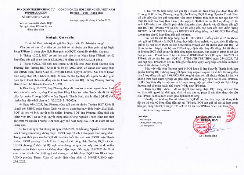 Liên quan đến nội dung tài khoản Quỹ bảo trì tại TPBank, tài liệu do Ban quản trị chung cư Imperia Garden cung cấp cho cư dân cho thấy: việc tài khoản tiền lãi của các hợp đồng tiền gửi bị tạm dừng giao dịch xuất phát từ quy định nội bộ của TPBank, yêu cầu phải có Quyết định công nhận Trưởng Ban quản trị mới của UBND quận khi thay đổi người đại diện đồng chủ tài khoản.