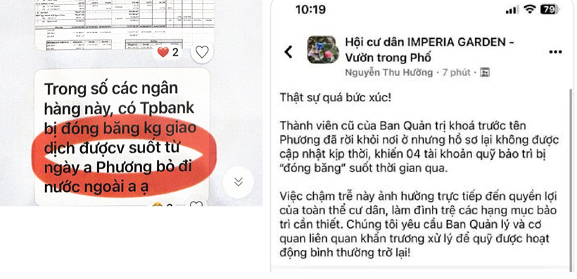 Tuy nhiên, theo phản ánh, trong thời gian sau đó, một số thông tin được đăng tải trên mạng xã hội, cụ thể là trong các nhóm Zalo cư dân, đã cho rằng việc tài khoản quỹ của Quỹ Bảo trì tại Ngân hàng TPBank bị “đóng băng” không giao dịch được trong suốt thời gian ông Phương “bỏ đi nước ngoài”, từ thông tin đó đã được nhiều cư dân lan truyền trong các hội nhóm trên các nền tảng mạng xã hội một cách nhanh chóng không kiểm soát, làm dấy lên nghi ngờ về trách nhiệm cá nhân, thậm chí là hành vi chiếm dụng, làm thất thoát quỹ.