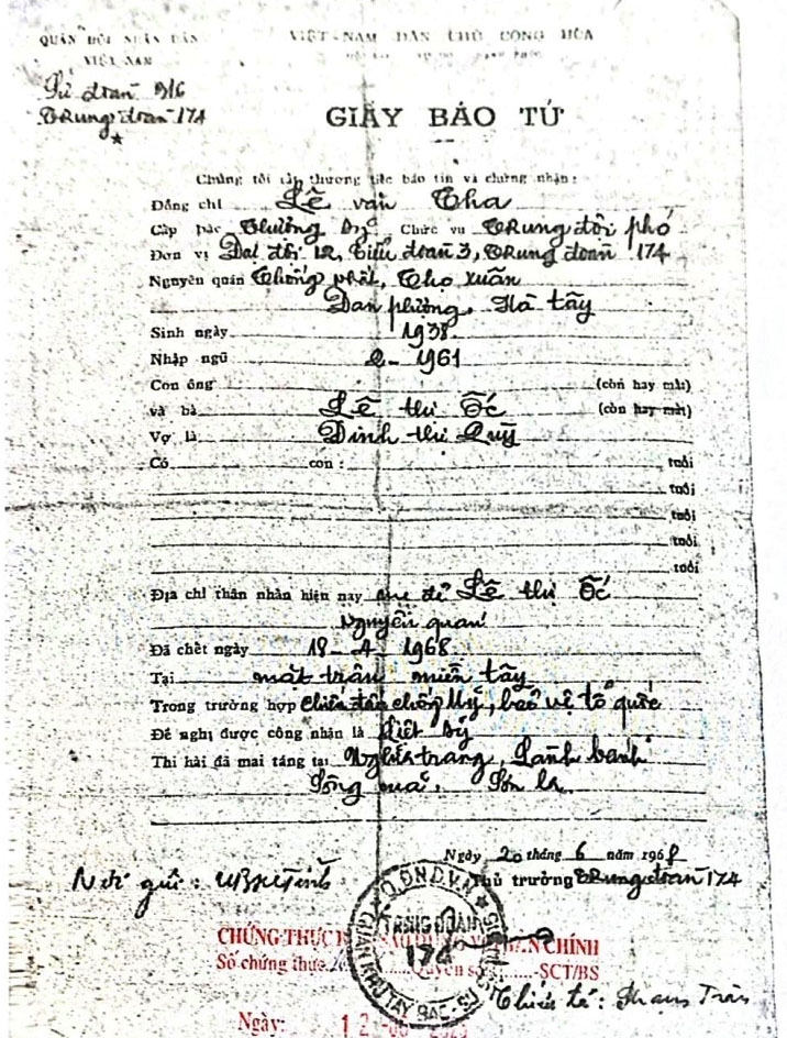 | Giấy báo tử của liệt sĩ Lê Văn Tha (bản công chứng). |