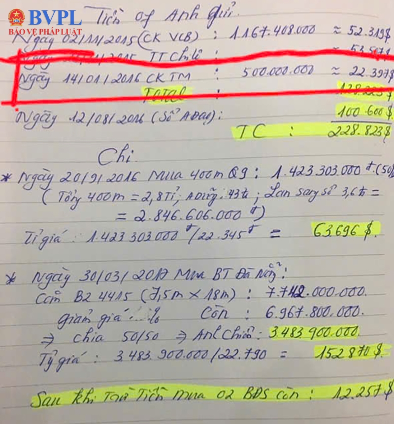 Ngoài khởi kiện đòi số tiền trên, ông Chiển còn bổ sung yêu cầu khởi kiện đòi số tiền 228,823 USD mà ông đã chuyển cho bà V. hồi cuối 2015 đến giữa 2016 để mua chung nhà đất ở Đà Nẵng và quận 9 – TP Hồ Chí Minh (cũ).