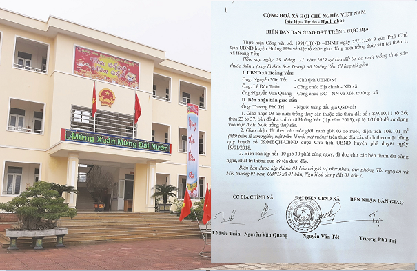 | Biên bản bàn giao đất trên thực địa cho ông Trương Phú Trị (ảnh nhỏ). Trụ sở UBND xã Hoằng Yến (ảnh lớn). |