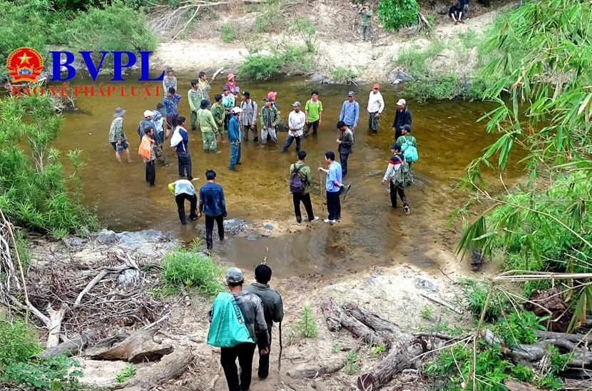 | Cơ quan chức năng dẫn giải các đối tượng vào khu rừng bị phá để thực nghiệm hiện trường. |