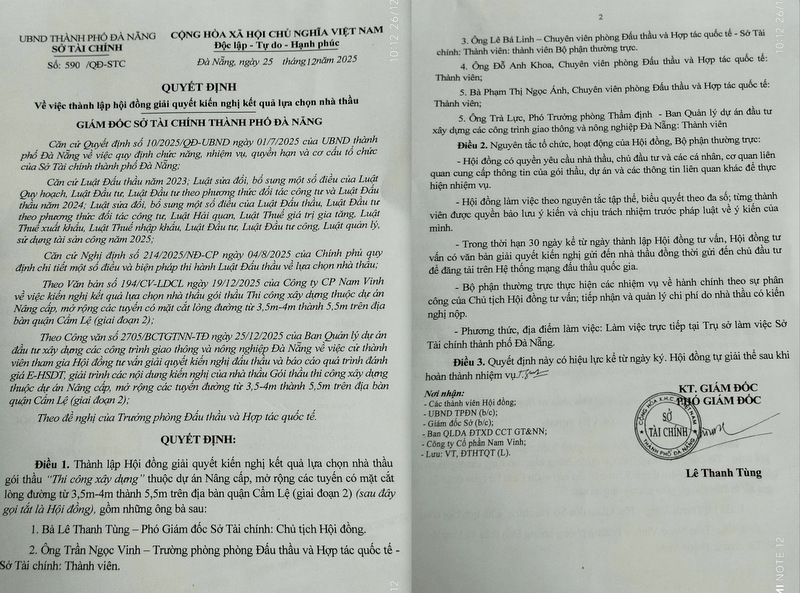 Ngày 25/12, Giám đốc Sở Tài chính TP Đà Nẵng đã ký Quyết định thành lập Hội đồng giải quyết kiến nghị kết quả lựa chọn nhà thầu đối với gói thầu thi công xây dựng thuộc Dự án nâng cấp, mở rộng các tuyến đường có mặt cắt từ 3,5m – 4m lên 5,5m trên địa bàn quận Cẩm Lệ (giai đoạn 2). Việc giải quyết kiến nghị nhằm bảo đảm quá trình lựa chọn nhà thầu tuân thủ đúng quy định pháp luật, công khai, minh bạch và hiệu quả.