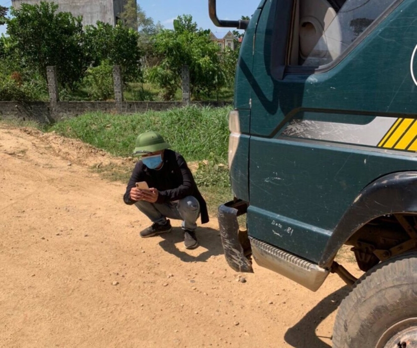 | Nhóm thanh niên xã hội lạ mặt thay nhau chặn đường, đe dọa người dân, không cho các xe ô tô xuống bãi sông chở cát sỏi (ảnh: người dân cung cấp). |