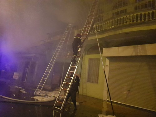 | CS PCCC dùng thang tiếp cận các nhà cao tầng bên cạnh để phun nước |