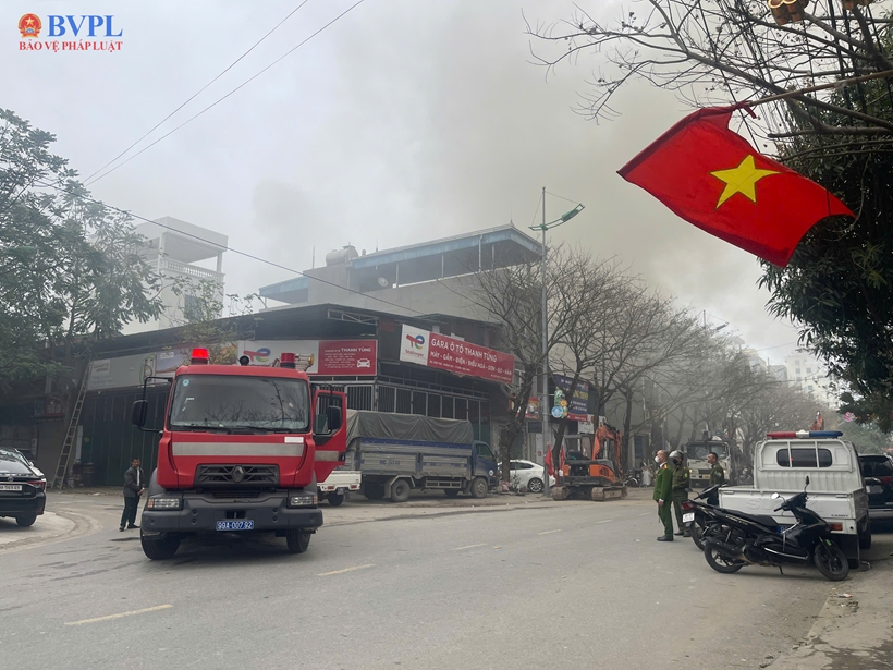 Ghi nhận của phóng viên Báo Bảo vệ pháp luật, tại hiện trường lực lượng chức năng điều nhiều xe cứu hỏa đến dập lửa. Do cháy xưởng nhựa lớn, ngọn lửa bốc lên dữ dội kèm theo cột khói đen.