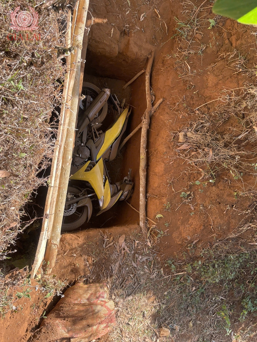 | Lực lượng Công an tìm thấy chiếc xe tang vật các đối tượng chôn giấu sau khi gây án. Ảnh: CA |