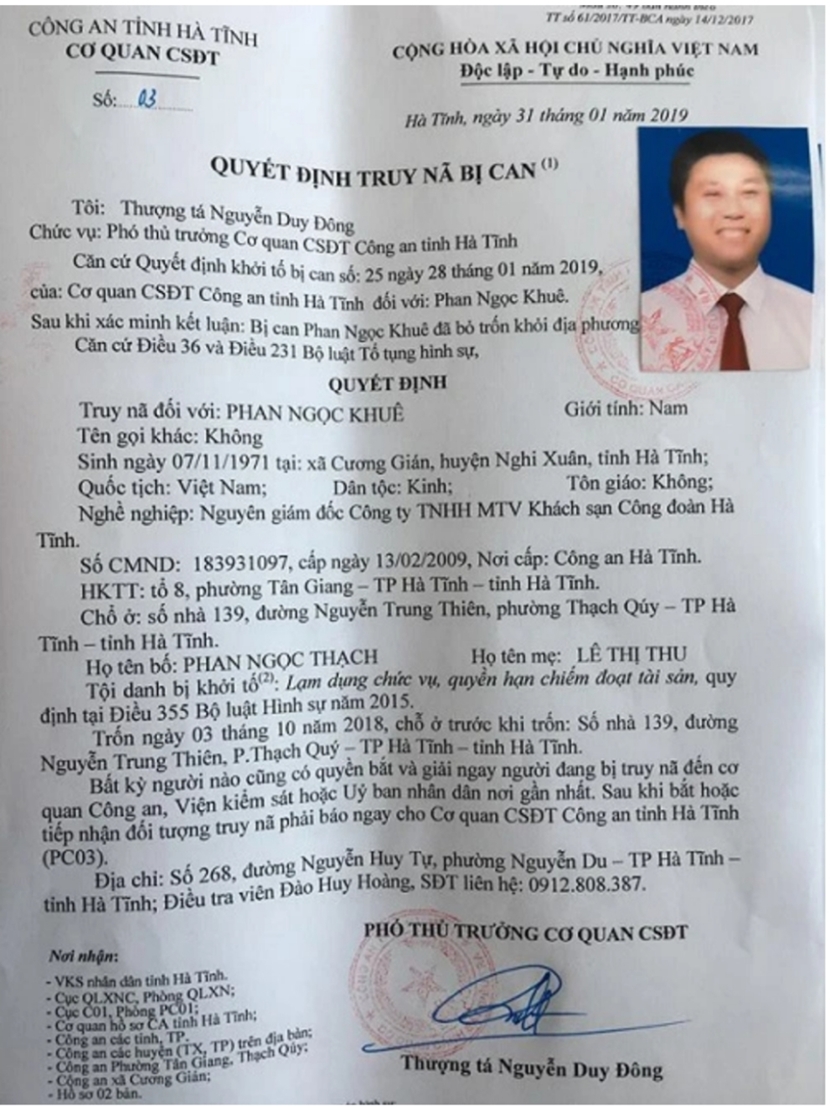 | Phan Ngọc Khuê bị truy nã về tội “Lạm dụng chức vụ, quyền hạn chiếm đoạt tài sản” |