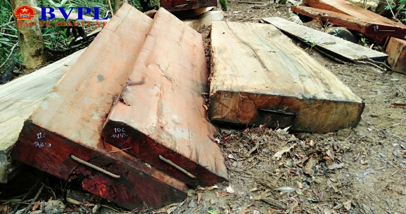 | Gỗ rừng bị lâm tặc cưa hạ trái phép nằm ngổn ngang. |