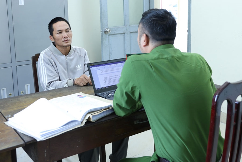 | Điều tra viên lấy lời khai đối tượng Tạ Văn Duyên. |