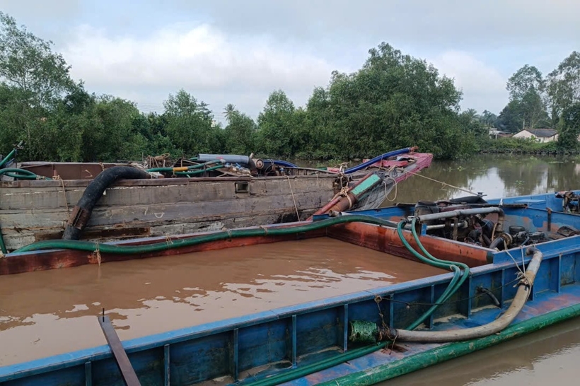| Phương tiện vi phạm tàng trữ khoáng sản trái phép bị bắt giữ tại thủy phận xã Ngãi Tứ, tỉnh Vĩnh Long. (Ảnh:CA) |