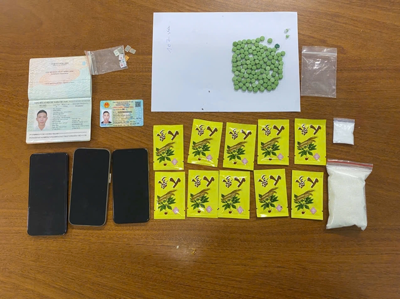 Nguyễn Hồng Quân bước đầu khai nhận: 10 gói màu vàng, bên ngoài có in chữ nước ngoài, bên trong mỗi gói có chứa chất bột màu trắng cam là ma túy (nước vui); 2 túi nylon trong suốt chứa tinh thể màu trắng là ma túy (loại Ketamine); túi nylon trong suốt chứa 108 viên nén màu xanh là ma túy (loại kẹo tổng hợp).