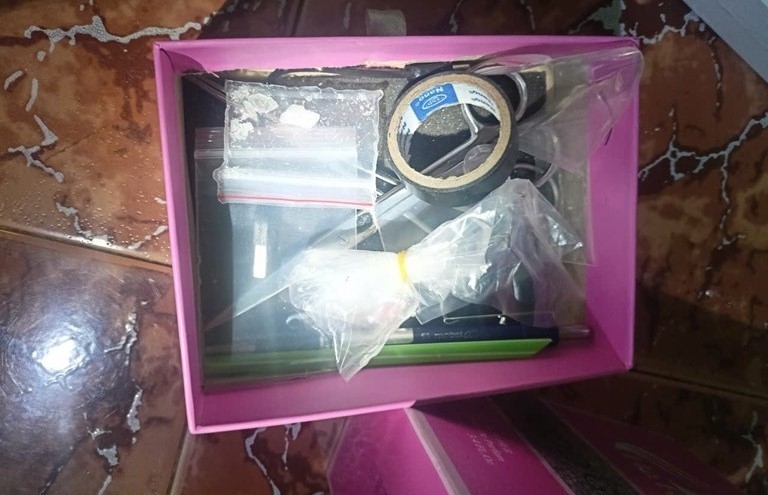 Tại hiện trường, lực lượng Công an thu giữ 1 bộ dụng cụ sử dụng ma túy và 1 gói nylon dạng túi zip bên trong chứa các tinh thể rắn màu trắng, các đối tượng khai nhận là ma túy tổng hợp.