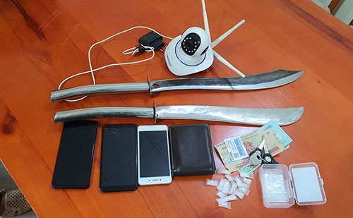 Tại nơi ở của Luật, Công an xã phát hiện thu giữ thêm 16 gói ma túy, 2 kiếm tự chế. Đặc biệt, các đối tượng này còn trang bị camera để cảnh giới nhằm qua mặt lực lượng chức năng. Được biết, các đối tượng này đã từng đi cai nghiện bắt buộc và có các tiền án liên quan đến trộm cắp tài sản và tàng trữ trái phép chất ma túy.