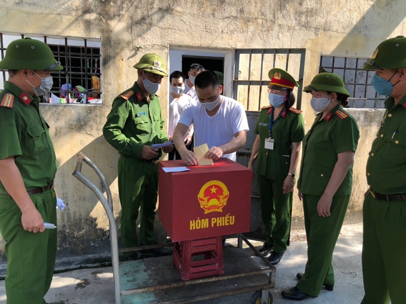 | Tại khu vực bầu cử số 1, thôn An Ngãi Đông, xã Hòa Sơn, huyện Hòa Vang, TP Đà Nẵng, thùng phiếu phụ của tổ bầu cử được chuyển đến cửa phòng tạm giam để 416 cử tri tại Trại tạm giam Công an TP Đà Nẵng đã thực hiện việc bỏ phiếu bầu cử.(ảnh: LT) |
