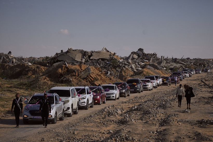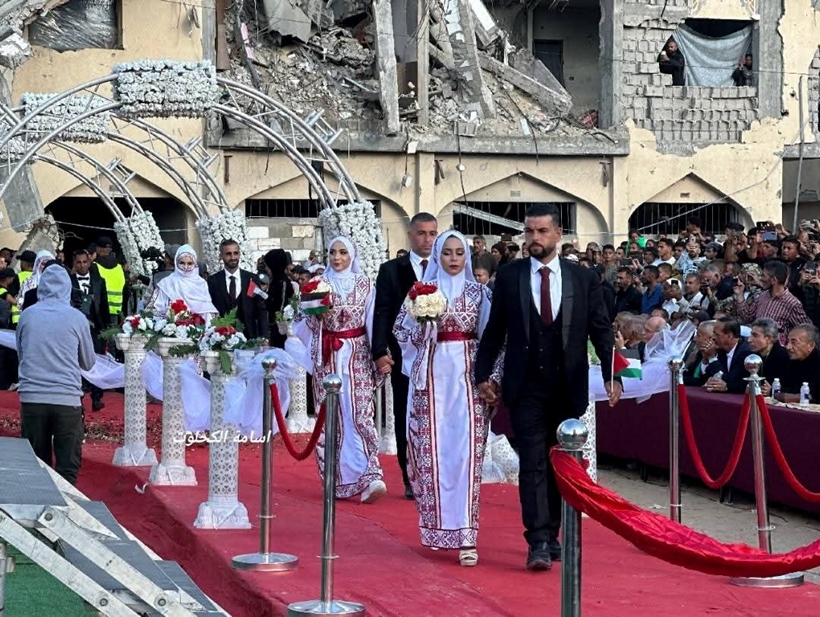 Những cô dâu trong bộ áo váy truyền thống với hai màu trắng, đỏ chủ đạo và chú rể diện vest lịch thiệp, nắm tay nhau đi qua những dãy phố với những tòa nhà đổ nát ở thành phố Khan Younis, phía nam Gaza.