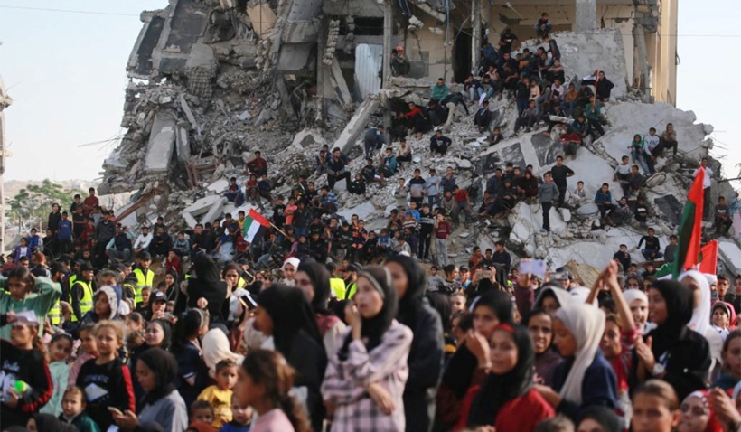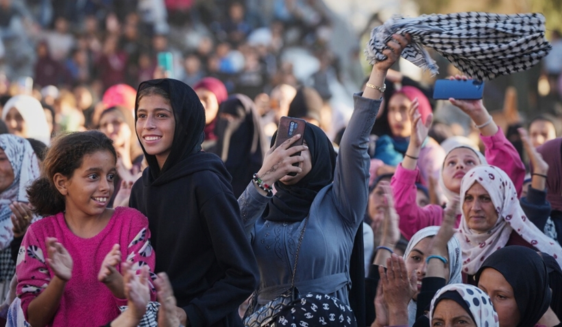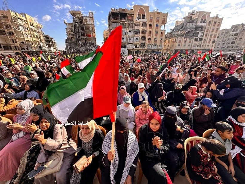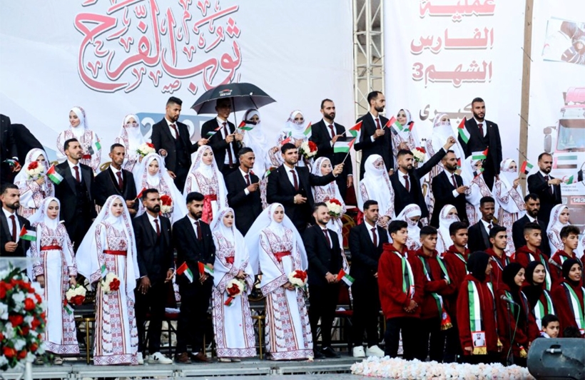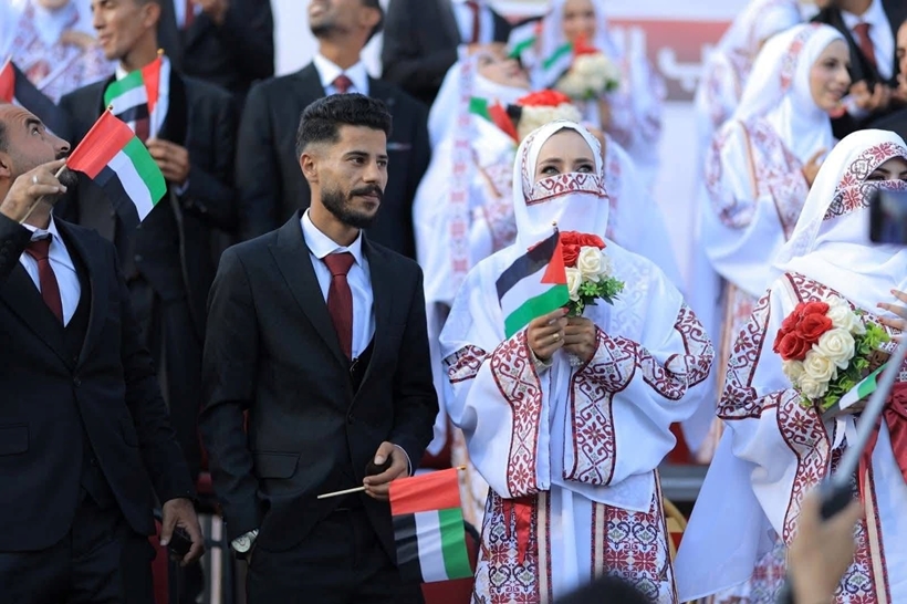 Giữa đám đông hò reo vẫy cờ Palestine, không khí lễ hội của một đám cưới tập thể ít nhiều đã bị ảnh hưởng bởi cuộc khủng hoảng đang diễn ra trên khắp Gaza.