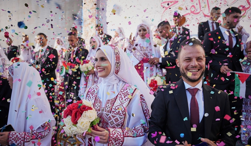 54 cặp đôi đã tham dự một lễ cưới tập thể trong một kiện có lẽ là chưa từng có trong vùng chiến sự, diễn ra hôm 2/12 ở Dải Gaza.