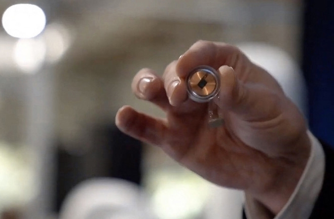 | Một con chíp cấy ghép của Neuralink được tỉ phú Elon Musk minh họa trong buổi thuyết trình ngày 28/8/2020. Nguồn: Neuralink / AFP. |