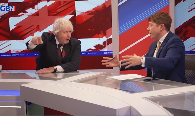 | Ông Boris Johnson (bên trái) trong cuộc trả lời phỏng vấn kênh truyền hình GBNews. Ảnh cắt từ video phỏng vấn, nguồn: GBN. |