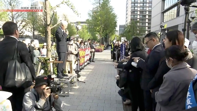 Cuộc mít tinh được tổ chức tại Tokyo hôm 17/4, với sự tham gia của các thành viên thuộc Nihon Hidankyo - tổ chức đại diện cho các nạn nhân sống sót sau các vụ ném bom nguyên tử Hiroshima và Nagasaki, Nhật Bản đầu tháng 8/1945.