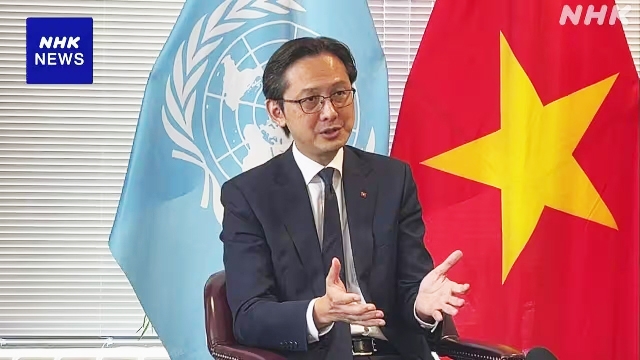 | Đại sứ Việt Nam tại LHQ Đỗ Hùng Việt- Chủ tịch hội nghị rà soát Hiệp ước Không phổ biến vũ khí hạt nhân lần thứ 11, trao đổi với Đài NHK, ngày 17/4. Ảnh: NHK. |