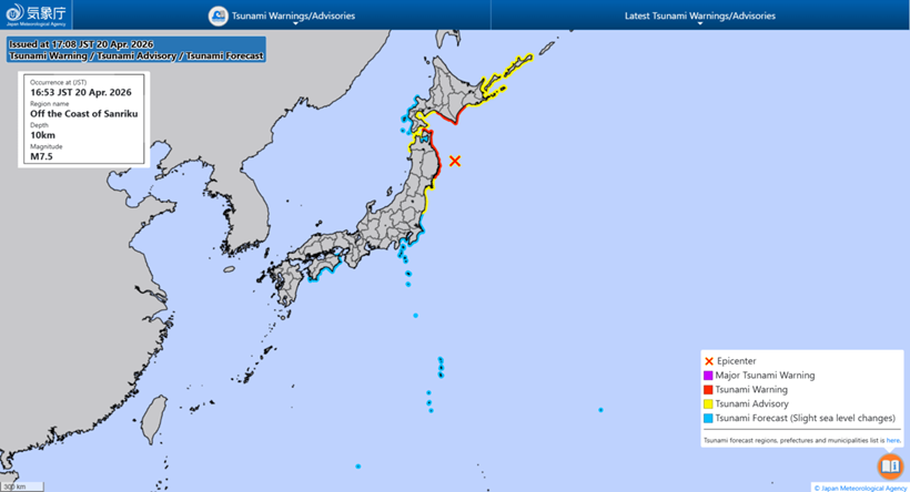 JMA đã ban hành cảnh báo sóng thần đối với vùng ven biển Thái Bình Dương thuộc tỉnh Iwate và một số vùng của Hokkaido và Aomori, trong đó dự báo sẽ có sóng thần cao tới 3m.