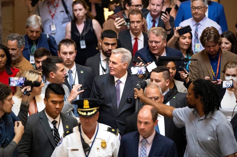 | Chủ tịch Hạ viện Mỹ Kevin McCarthy tỏ ra hoan hỷ khi tiếp xúc với truyền thông tại Tòa nhà Quốc hội ngày 31/5, cho rằng dự luật được thông qua là một thành công. Ảnh: Kevin Dietsch/Getty. |