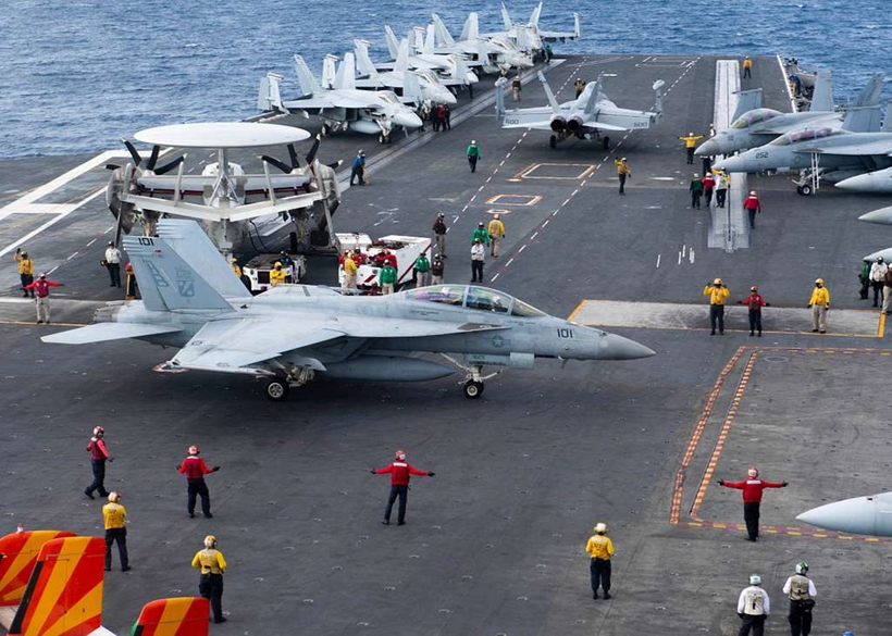 | Một chiếc F/A-18F Super Hornet bay phía trên tàu sân bay lớp Nimitz USS Harry S. Truman, ngày 27/11. Ảnh:U.S Navy/ Lily Moorhead. |
