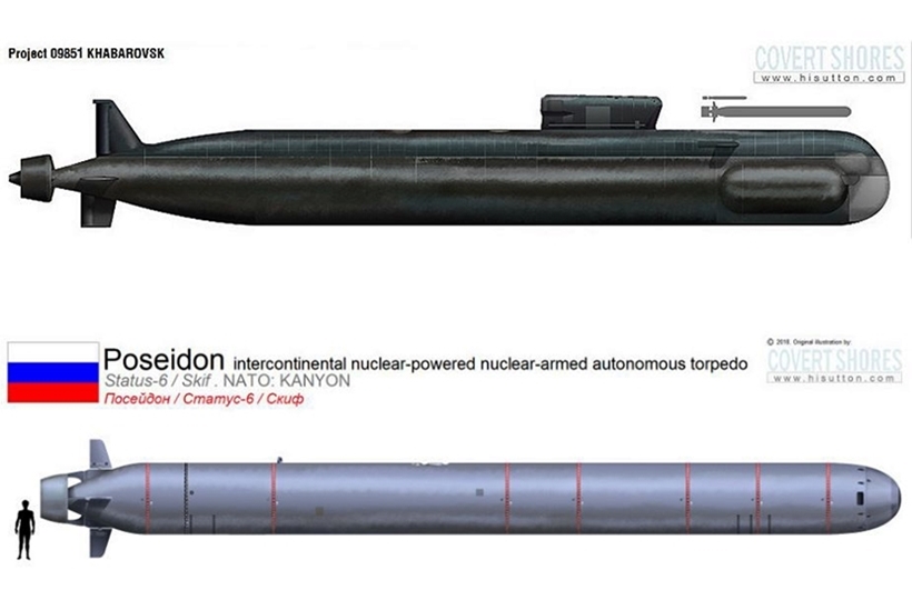| Bản vẽ tàu ngầm hạt nhân Khabarovsk (hình trên), tàu ngầm thiết kế mang ngư lôi Poseidon (hình dưới). Nguồn: Hisutton. |