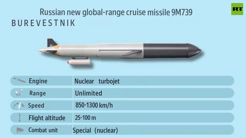 Theo truyền thông Nga, Burevestnik, một loại tên lửa hành trình Tomahawk của Nga, đã thử nghiệm thành công vào tháng 1/2019, có phạm vi di chuyển cũng như khả năng cơ động “không giới hạn” và có thể vượt qua mọi biện pháp phòng thủ đã biết.