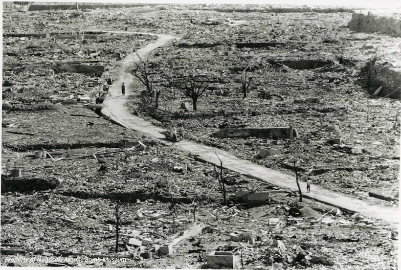 | Thành phố Nagasaki sau khi bị ném bom nguyên tử. Nguồn: Bảo tàng bom nguyên tử Nagasaki. |