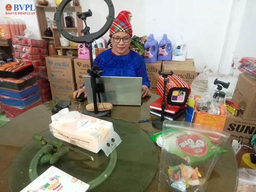 | Chị Vi Thị Vinh livestream bán mật ong rừng và các mặt hàng thổ cẩm. |