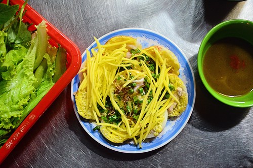 Chấm ngập chiếc bánh nóng vừa được mang ra vào nước mắm rồi chậm rãi đưa vào miệng, bạn sẽ ngửi thấy mùi thơm của bánh còn phảng phất, cảm nhận độ giòn của bột sau khi chín, vị ngọt của nhân tôm, thịt quyện với nước mắm cay nồng.