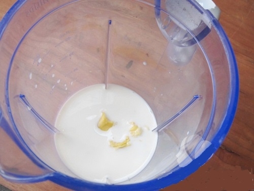 Cho phần sữa tươi, sầu riêng và nước cốt dừa vào máy xay sinh tố xay đều (có thể cho thêm đường nếu muốn ăn ngọt).