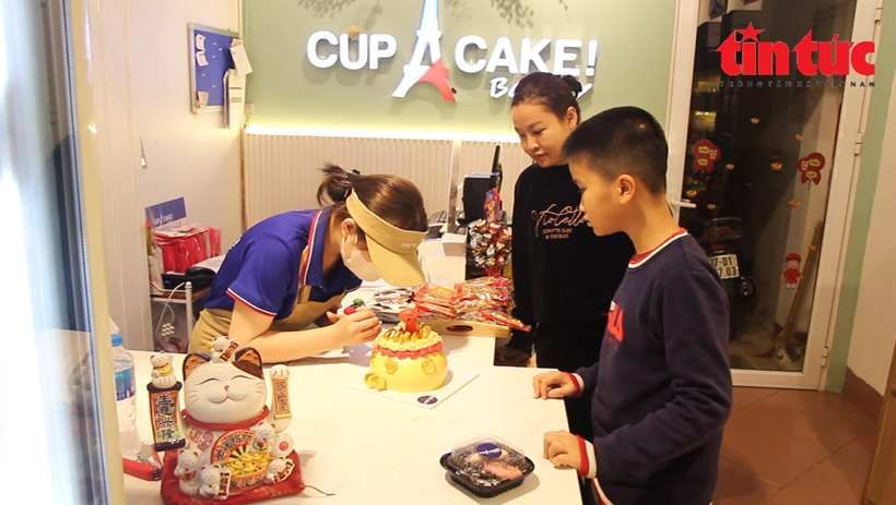 | Chị Vũ Thị Thanh, quản lý một tiệm bánh trên đường Tô Hiệu (Cầu Giấy, Hà Nội) cho biết: "Hàng năm, cứ gần đến ngày vía Thần Tài, lượng khách đặt bánh kem tài lộc tăng cao. Trong ngày mùng 10 tháng Giêng, cửa hàng ước tính bán hơn 300 chiếc bánh kem tài lộc". |