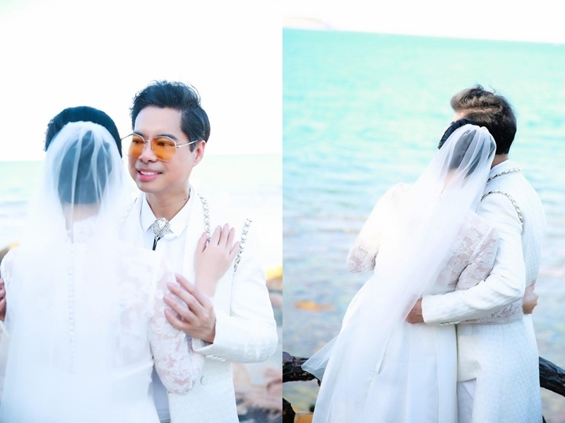 | Nam ca sĩ có nhiều cử chỉ thân mật như ôm eo, nắm tay với người phụ nữ mặc váy cưới. |